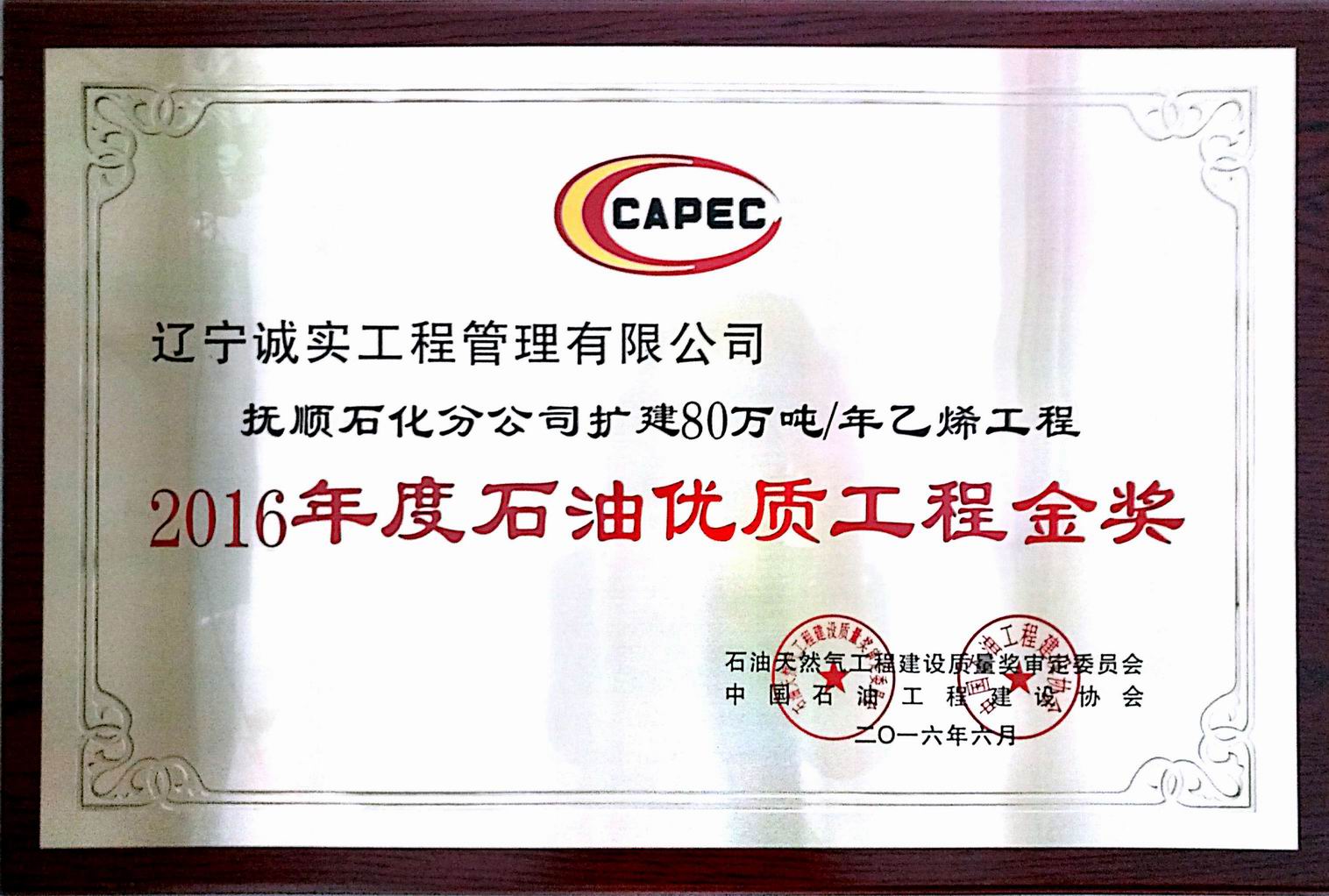 2016年石油优质工程金奖(抚顺石化分公司扩建80万吨/年乙烯工程)