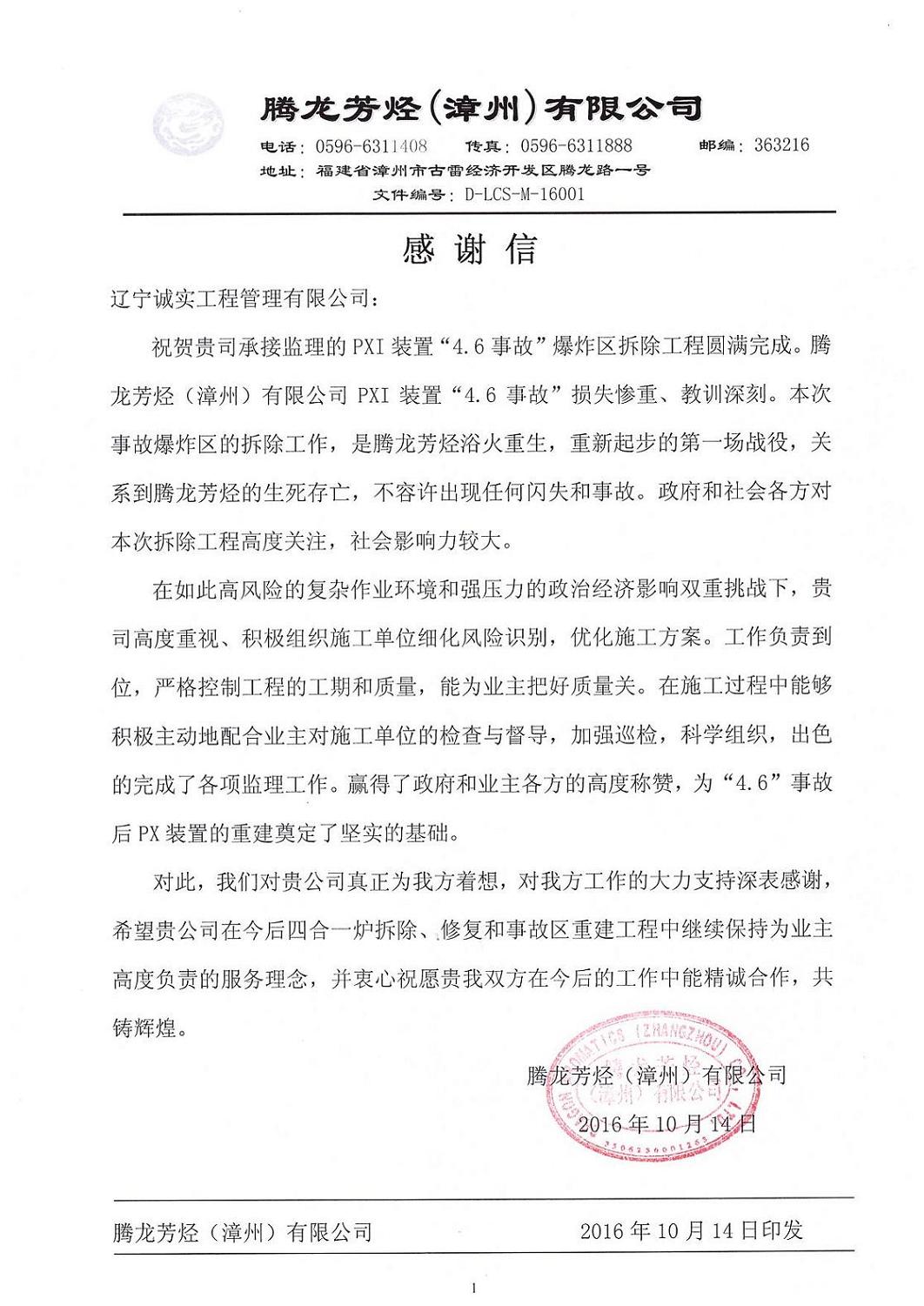我公司监理人员在“腾龙芳烃(漳州)有限公司PXI装置4.6事故爆炸区拆除”工程监理服务工作中,得到了业主单位的认可和肯定,对我们的工作表示十分满意,特发感谢信提出表扬。