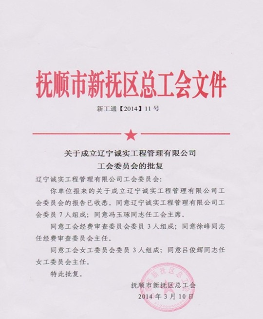 经过近两个月的筹备,诚实工会现已履行完毕各个筹备程序,抚顺市新抚区总工会已正式批准成立乐鱼手机官方网站入口,乐鱼(中国)工会委员会。公司工会由7名委员组成,下设经费审查委员会和女工委员会。公司工会将根据机关及项目部的实际情况,相应成立工会分会和工会小组,发挥工会在企业中的积极作用,为企业的发展做出贡献。