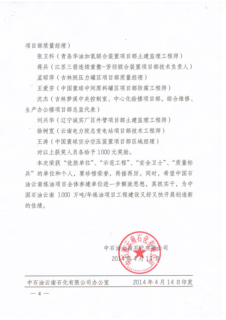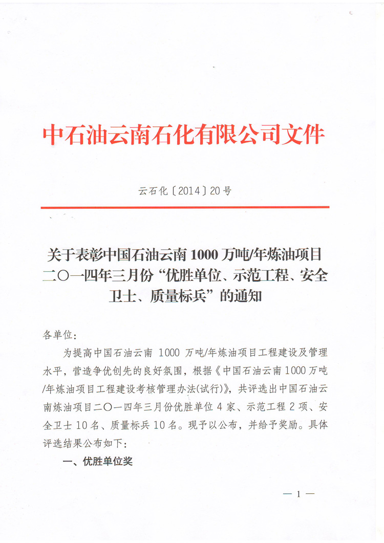 我公司荣获中国石油云南1000万吨/年炼油项目2014年3月份“优胜单位”称号