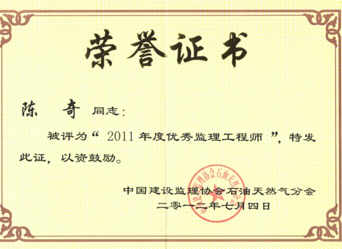 陈奇同志被中国建设监理协会评为年度优秀监理工程师