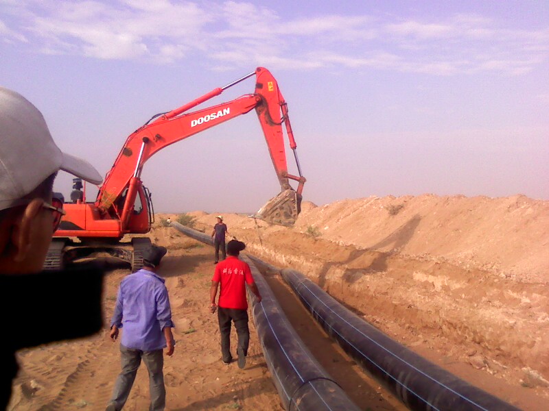 巴二建在主管线敷设已熔接好的DN500PE管